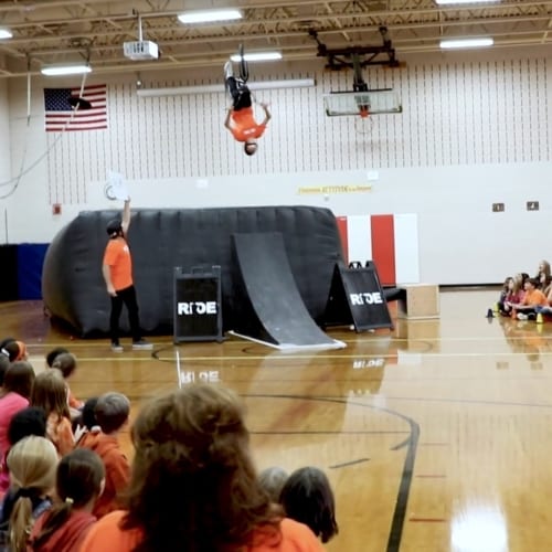 This program is flexible and easy for schools to host. Our portable ramp and sound system set up quickly on gym floors or blacktop without causing any damage, and we work with administrators to align the assembly with PBIS, SEL, or Red Ribbon Week themes. If you’re looking for a high-energy assembly that motivates kids and reinforces core values, the “BMX Kid” School Assembly is the perfect choice.